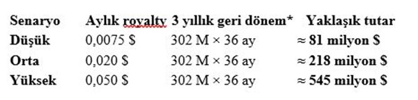 *Faiz, yargılama giderleri ve karar sonrası devam eden lisans bedeli hariç.